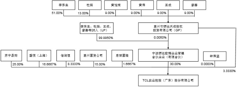 砺达致辉持有TCL控股30%股份,李东生持有砺达致辉63.1%;砺达天成持股比例3.333%,李东生持有砺达天成51%的股份。因此,李东生对TCL控股间接持股比例达20.63%。
