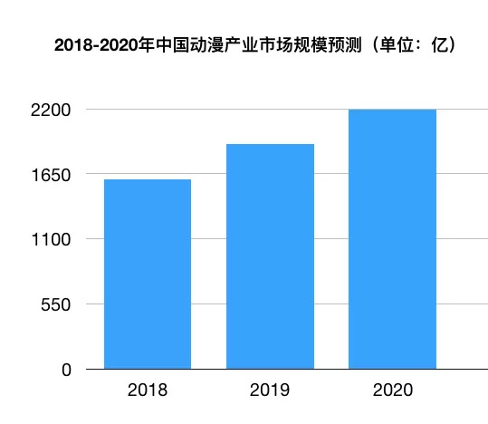 有分析机构预测,未来动漫行业的盘子很大。截止2017年底,我国动漫产业产值达到1500亿元,在文娱业总产值中占比24%;在2017年的基础上,分析机构预测到2020年动漫产业总值预计将达到2200亿,未来五年年均复合增长率8.1%;同样,动漫衍生品市场也在持续增长,预计2018年我国动漫衍生品行业的市场规模将近650亿元,至2020年该行业的市场规模有望突破1000亿元。