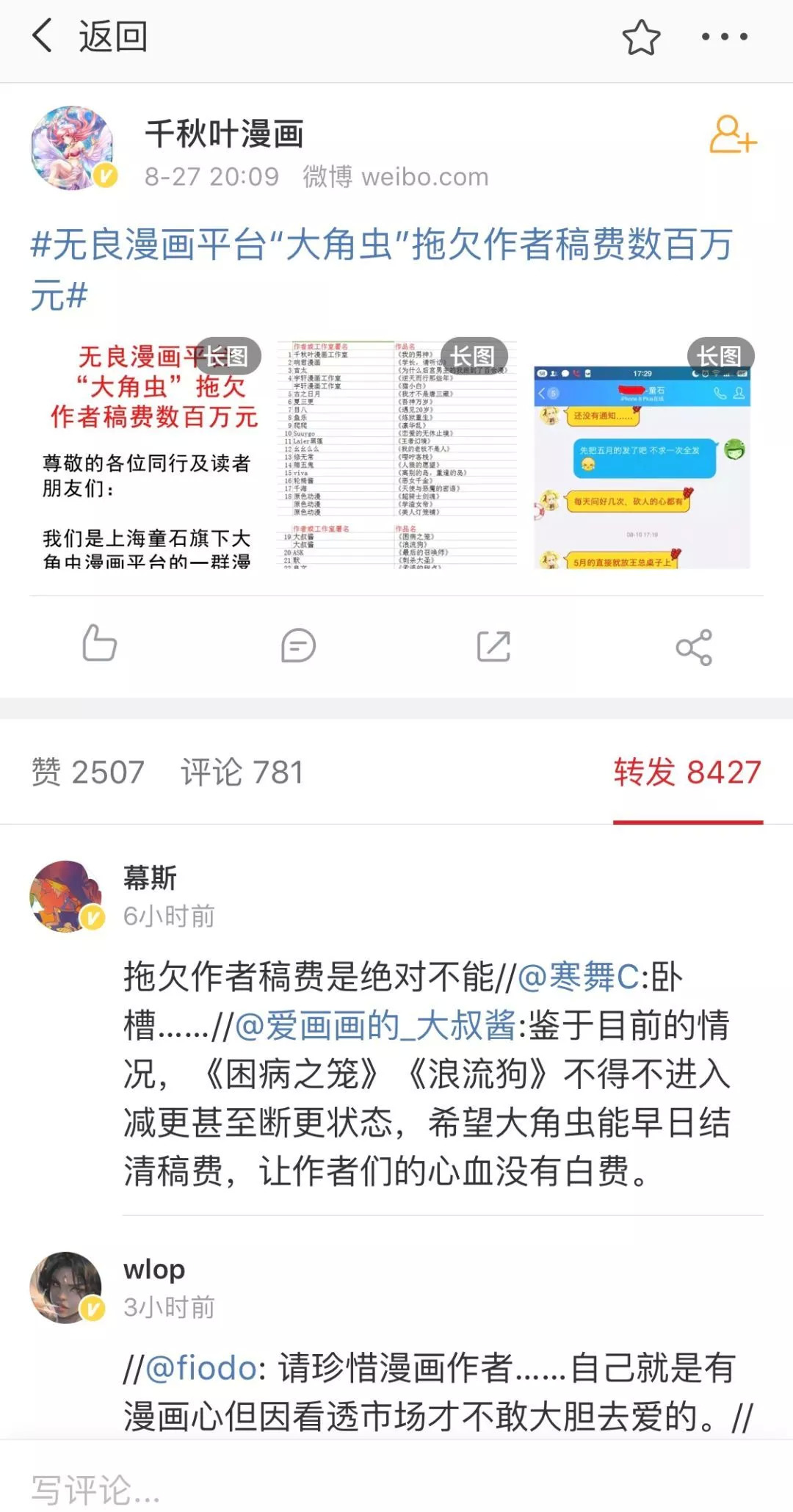 一个月之后,微博主千秋叶漫画爆料大角虫漫画平台欠薪四百万;