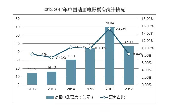 不怪投资人,因为在2017年,动画电影确实遭遇了滑铁卢,数据显示,相比2012年-2016年动画电影数量、票房的不断增长,2017年是个转折点,电影数量、票房均出现了下滑,2017年动画电影总票房为47.17亿元,相比2016年减少了22.87亿元,同比下滑32.7%。