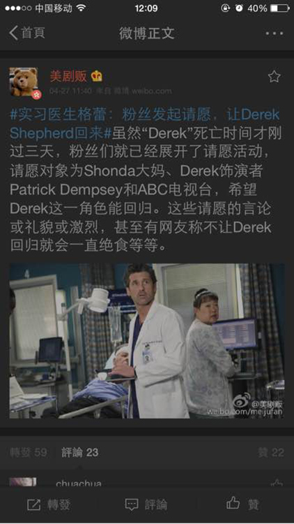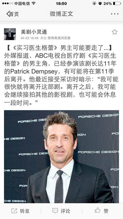 据外媒报道,ABC电视网热播剧《实习医生格蕾》(Grey’s Anatomy)的男主角Derek Shepherd在上周四的一集中因车祸死去。而饰演该角色的帕特里克·德姆西(Patrick Dempsey)也将退出这部剧集。不过此前有消息称,帕特里克已经签约了12季,而上周四的车祸还只是在第11季中。