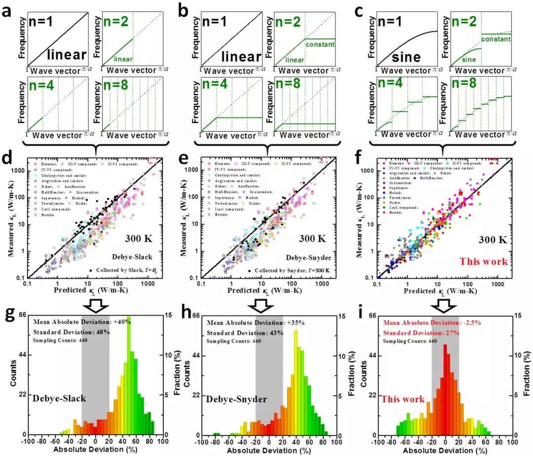 笔者胆大妄为一回,掘地三尺,收集了高达四百多种固体材料热导率的实验结果,并与理论预测结果对比。我们清晰看到,这种声子分布成功消除了此前基于Debye线性分布近似对晶格热导率的整体高估问题,将晶格热导率预测的绝对偏差从此前的+40%降低至0附近,准确度获得大幅提高(图4c & 4f & 4i),可谓成功还原声音彩虹的本色。