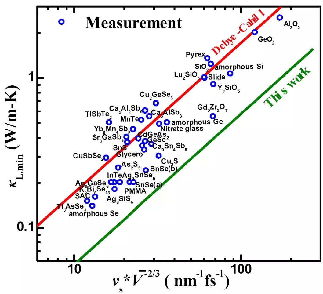 图5.基于此前Debye – Cahill模型(红线)和笔者所发展的声子色散模型(绿线)所预测的最低晶格热导与实验值比较。注意,这是预测的最低热导率,客观上应该不允许实验值落在其右下方。