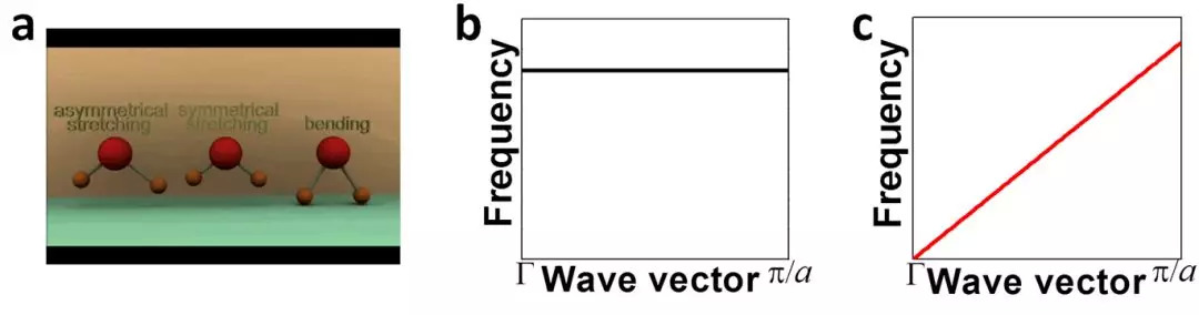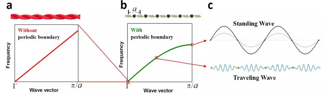 图6. (a)基于连续介质弹性波的Debye色散;(b)考虑原子周期性分布的声子色散;(c)晶格驻波(上)与晶格行波(下)。