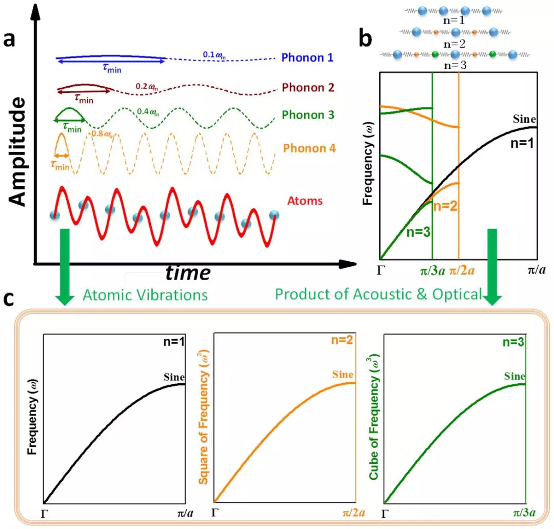 如果细看一下声音彩虹的起源:晶格振动,即声的后代“声子”,会看到声的更多模样。由于声子(狭义定义)是周期性排布原子近似简谐振动模式的集体量子化描述,实空间中的原子振动轨迹就成为各种声子波形的叠加(图7a)。而联系起时域与频域之间的重要桥梁,莫过于傅里叶变换了。根据卷积定理:函数卷积的傅里叶变换是函数傅里叶变换的乘积,即时域中的卷积(原子振动轨迹)即为频域中的乘积(声子)。声子谱中各种声子色散关系的乘积拟或呈现出通用的一致性规律(图7b & 7c)。在这样的物理背景及规律下,声子输运研究发展又将迎来怎样的机遇拟或面临怎样的挑战?