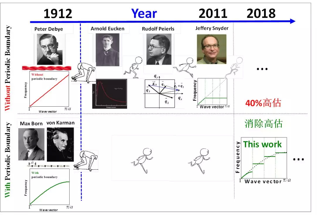 图8.不考虑固体材料中(已有工作,上半图)和考虑固体材料中(本工作,下半图)原子周期性排布晶格热传导理论发展简图。