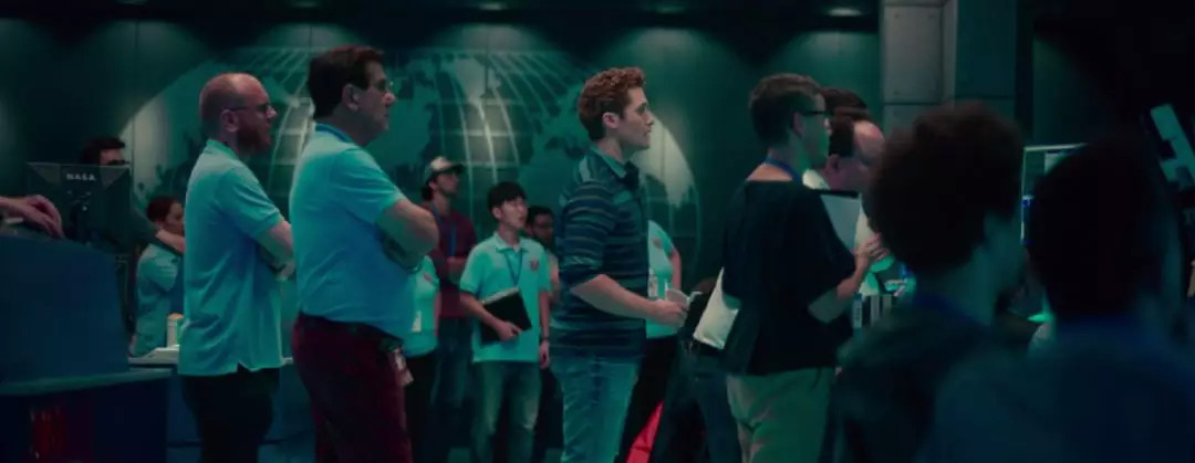 飞碟继续坠落,并伴随其他物体进入大气层,一群外国人庄严盯着远处,背景一台电脑上赫然印着NASA(美国太空总署)的字样。