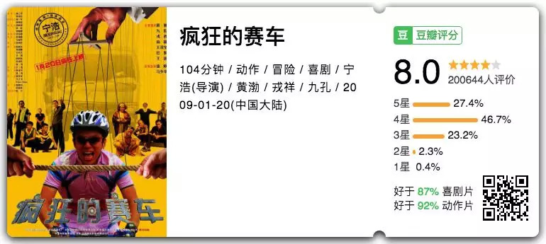 3年后,[疯狂的赛车]再度袭来,以1000万成本获得过亿票房。续写了小成本电影票房神话。