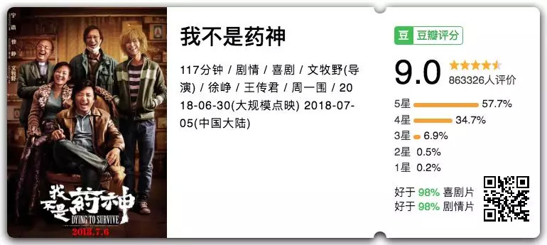 电影[我不是药神]豆瓣评分9.0,是2018年口碑最好的国产电影