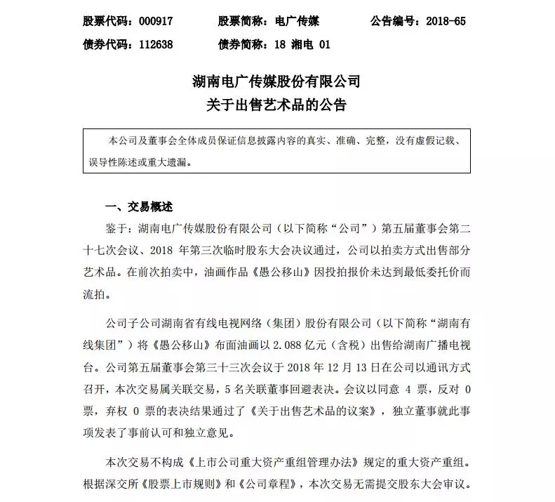 12月15日,湖南电广传媒发布《关于出售艺术品的公告》:子公司湖南有线集团将徐悲鸿的油画《愚公移山》以2.088亿卖给关联方、以前的实控人湖南广播电视台。2.088亿的交易额也打破了中国油画价格的世界纪录。