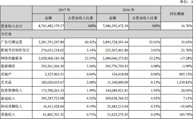 但近两年电广传媒可谓是水逆不断,2017年,电广传媒出现近10年来的首次亏损,2017年电广传媒年报显示:公司全年实现营业收入87.41亿元,同比增长16.76%,归属于上市公司股东的净利润为亏损4.64亿元,同比下降239.37%,其中公司网络传输业务实现收入20.59亿元,较上年同期下降17.28%。