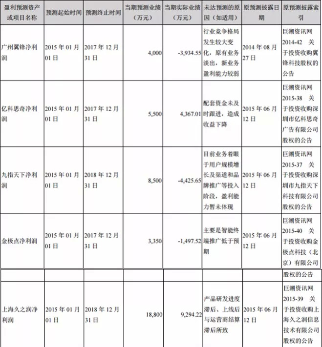 作为回应,上海久之润承诺2015-2017年扣非净利润不低于1.3亿元 、1.56亿元及1.88亿元;九指天下承诺2015-2016年收入不低于1亿元、1.5亿元,2015-2018年扣非净利润不低于550万元、750万元、8500万元和1.2亿元;亿科思奇承诺2015-2017年扣非净利润不低于3800万元、4800万元和5500万元;金极点承诺2015-2017年扣非净利润不低于1200万元、2150万元和3350万元。