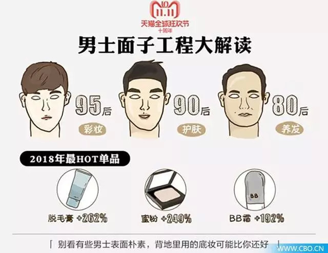 不满足于男士洁面、乳霜、面膜的基本护肤三件套,阿里巴巴最新发布的2018年《中国男性消费报告》显示,今年淘宝男士彩妆成交大爆发,增长达140%。其中,粉底、遮瑕和眼线笔成为了淘宝上最受男士欢迎的彩妆Top3产品。淘宝数据显示,男人购买彩妆护肤品趋向低龄化,95后男生成最爱美担当,每三个买粉底的男孩里就有一个是95后。