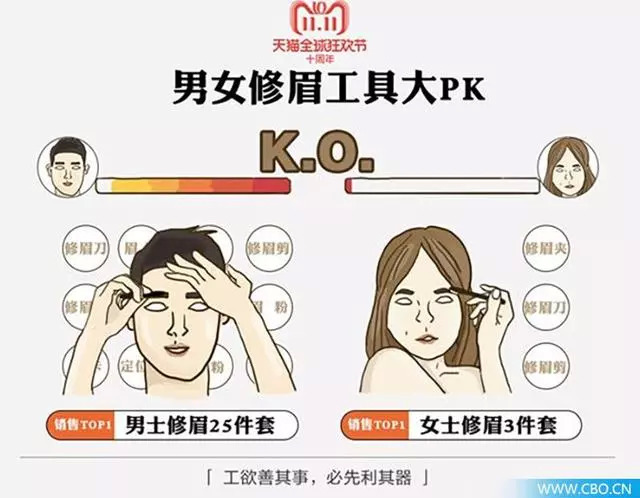 天猫在今年双11发布的《中国男性好色报告》显示,底妆类产品成为中国男性打开“面子工程”的第一把钥匙,2018年淘宝天猫BB霜销量暴涨192%,蜜粉大涨249%。更“夸张”的是,淘宝天猫上最畅销男性修眉商品是一组“男士修眉25件套”,相比之下,女性热买的“女士修眉3件套”就“不值一提”了。