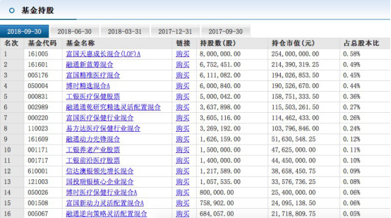 富国天惠目前持有同仁堂的股票数量最多,持有800万股,占基金净值比例为3.74%;融通新蓝筹持有214万股,占基金净值比例为10.21%;富国净值医疗持有194万股,占基金净值比例为9.41%。