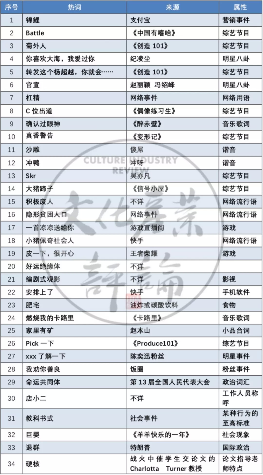 文化产业评论盘点整理了34条年度网络流行用语,相较于2017年,数量更多、传播范围更广、来源更加多元,在沿袭上一年度明星婚姻、现象级综艺的热播等超高话题热度事件的基础上,也具有诸如传递正能量、以自嘲与吐槽缓解生活压力的新特点。