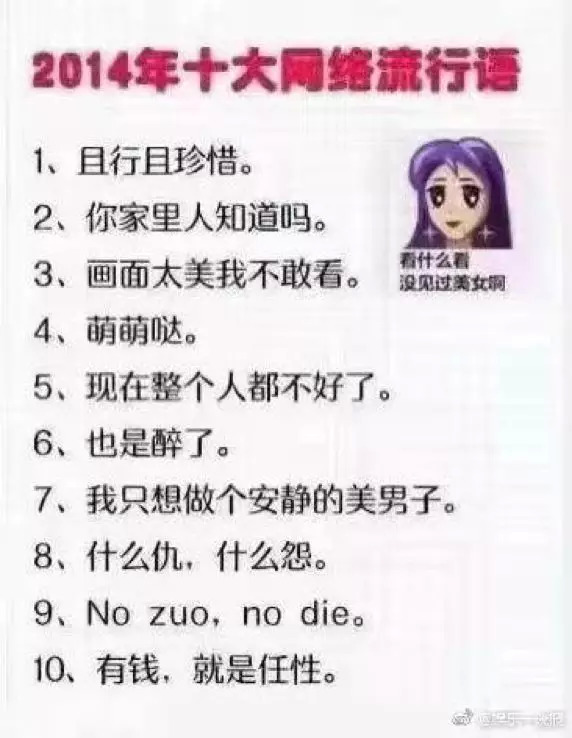 1. 网络热词反映的是对美好生活的向往和对未来充满信心。无论是支付宝锦鲤、还是王思聪热狗、杨超越幸运等一系列网络事件中,即便中奖几率很小的营销活动,网民参与热情乐此不疲,更多不是为奖励本身,而是对生活的热爱,对未来的憧憬,传播本身也成为游戏。
