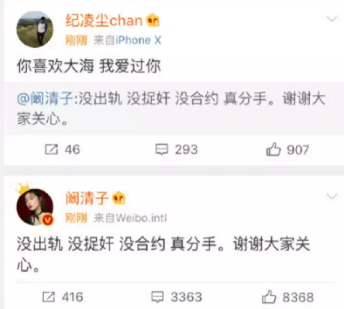 来源:2018年7月31,纪凌尘转发阚清子分手博文:“没出轨没捉奸没合约真分手。谢谢大家关心。”并附评论:“你喜欢大海我爱过你。”这句话一时成为网友们的槽点,甚至一度成为新晋渣男语录。