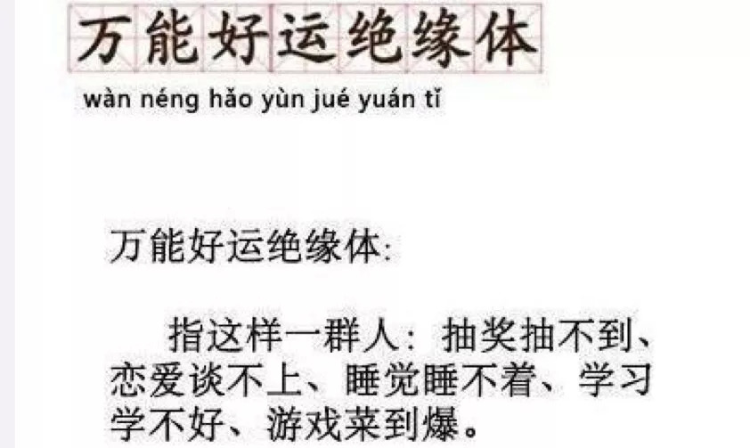 注解:指这样一群人:抽奖抽不到、睡觉睡不着、学习学不好、游戏菜到爆。