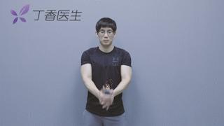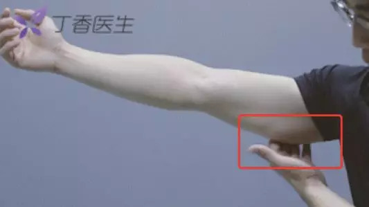 先将手臂完全伸直,向外拧转肘窝,用力将整条手臂靠近身体。