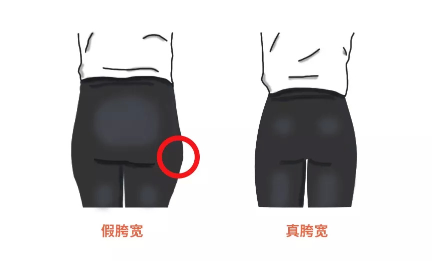 如果你的膝盖内旋了,会让你的股骨(上图红圈处)更加突出,和右边的真胯宽相比,臀部看起来大而扁。