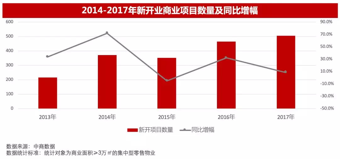 根据2018年发布的2017年数据显示,全国计划开业购物中心项目共970个,实际新开项目504个,总体量超过4600万㎡,数量创历史新高;466个项目延期开业,开业率下降至52%。2014年后,购物中心供应增速放缓趋势明显,未来开发商对增量商业市场持更为谨慎的态度,盘活存量商业或将成为企业生存“最强助攻”。