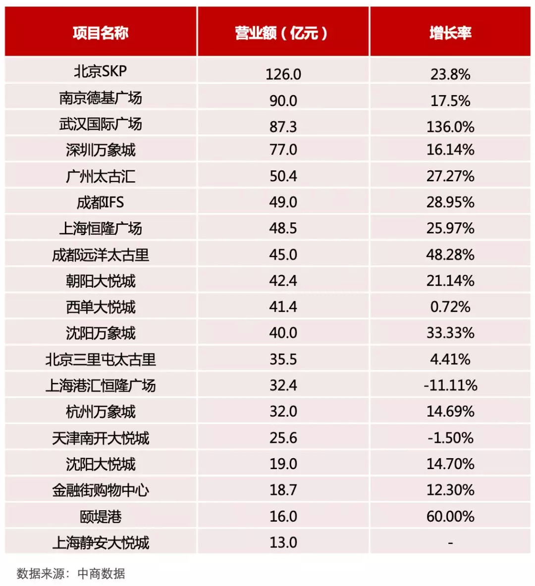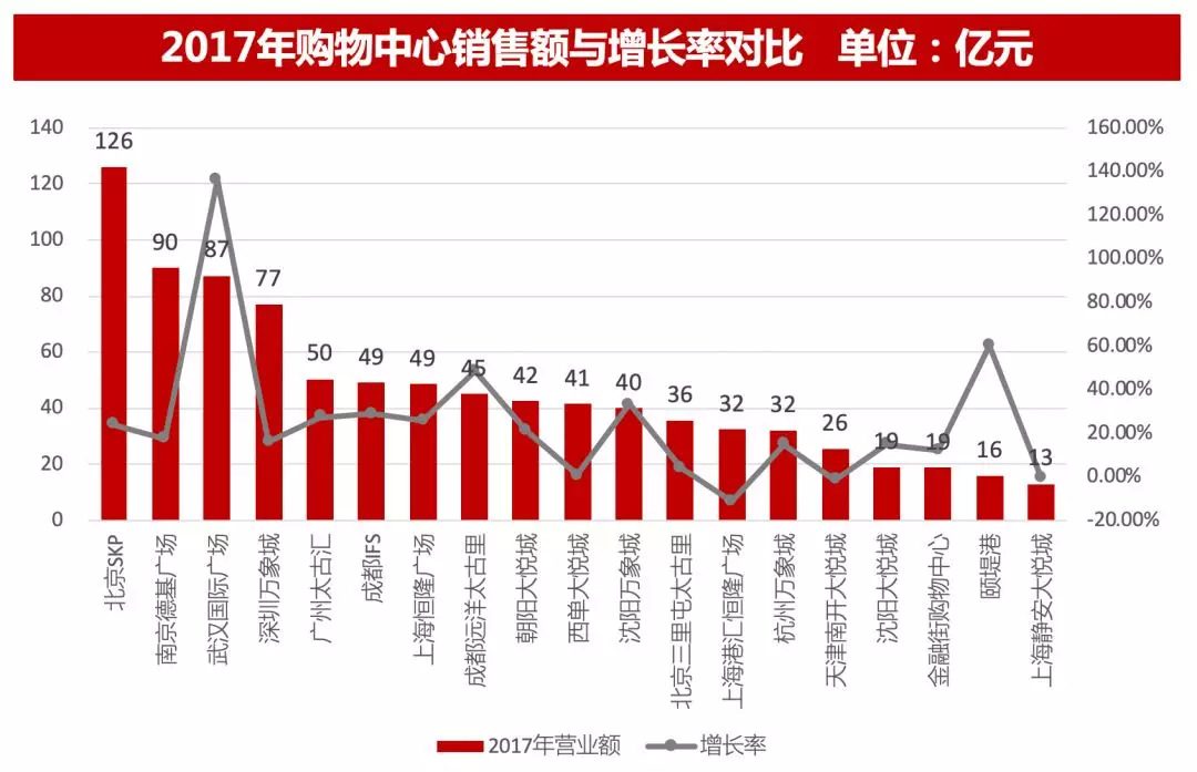 2017年,北京SKP以126亿元的业绩,夺得2017年度全国购物中心“店王”,同时达到了23.8%的同比增幅,上升趋势明显,南京德基广场营业额90亿元,排名第二,武汉国际广场营业额87.3亿元排名第三,但其增长率达到了136%,为营业额增长幅度最大的购物中心。其他标杆型购物中心例如深圳万象城、太古汇、成都IFS也均取得了不错的成绩。