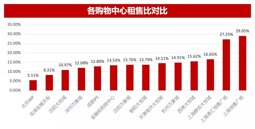 目前大部分购物中心租售比在14%左右,恒隆广场租售比最高,应与其较高的租金收入有关