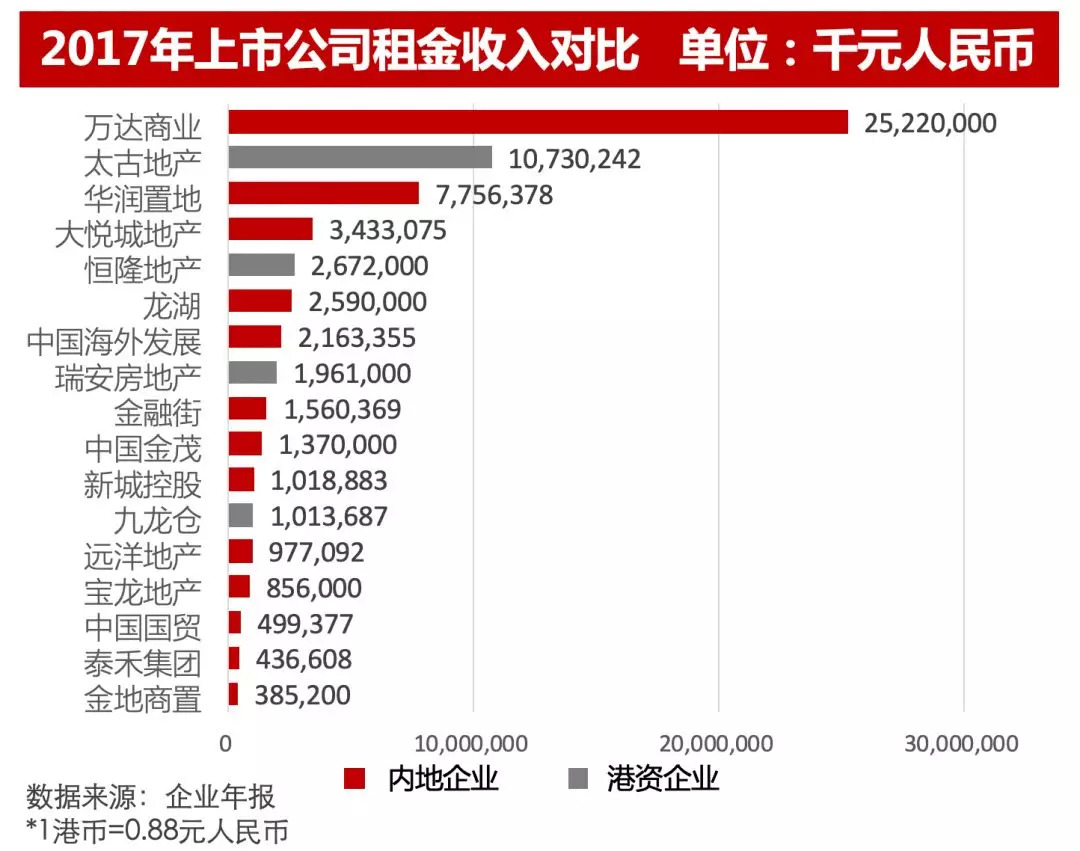 从租金收入来看,在各大上市公司2017年投资物业租金收入对比中,万达商业以全年约252.2亿租金收入位于榜首,太古地产全年租金收入约107.3亿元,位于第二,华润置地约77.6亿元,位于第三。虽然港资企业的租金增长率不高,但其租金收入仍居于前列,可见其商业项目经营实力较强。
