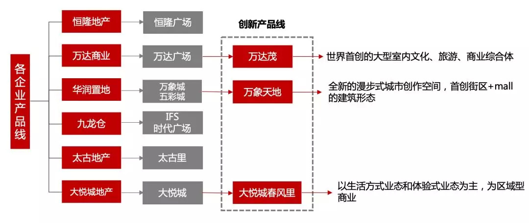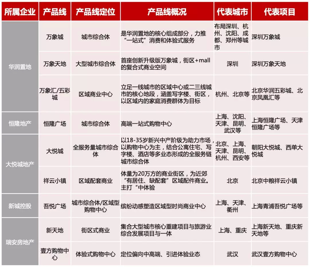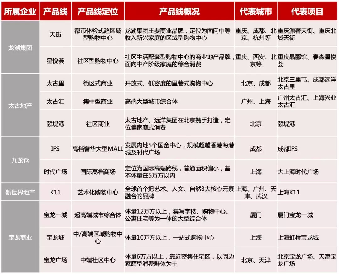 各大企业的产品线中,内地企业的产品线更偏向于社区型、区域型购物中心,而港资企业如恒隆地产、九龙仓以及太古地产的产品线以高端型购物中心为主