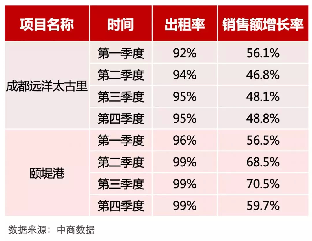 在销售额数据中,最值得关注的是成都远洋太古里和颐堤港项目,二者均为远洋集团与太古合作的项目,并且都表现出了较高的增长。尤其是颐堤港,在2017年四个季度中,每季度销售额增长幅度都超过了55%,从第二季度开始,商场出租率达到了99%。