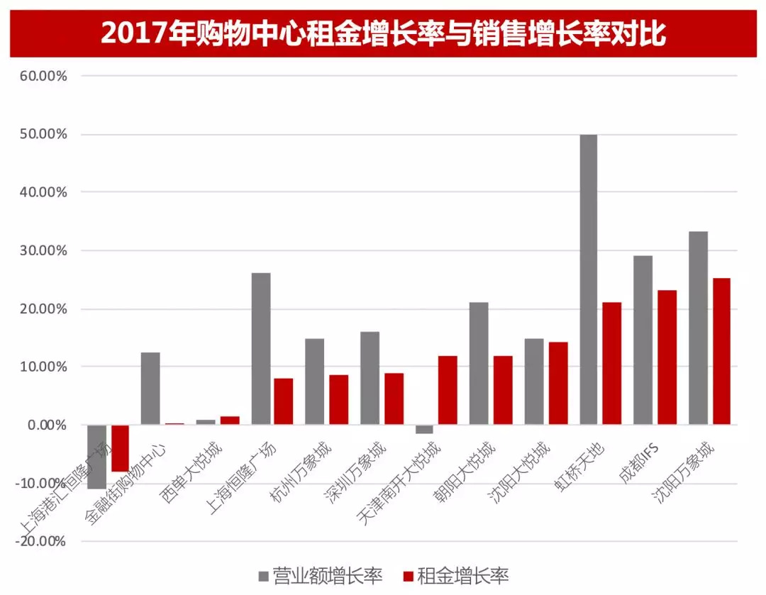 从租金增长与销售额增长两方面来看,虹桥天地、沈阳万象城与成都IFS 2017年表现较好,销售额与租金均实现较高增长,虹桥天地在这三个项目中,销售额增长率是最高的,与其近两年的品牌调整有关。