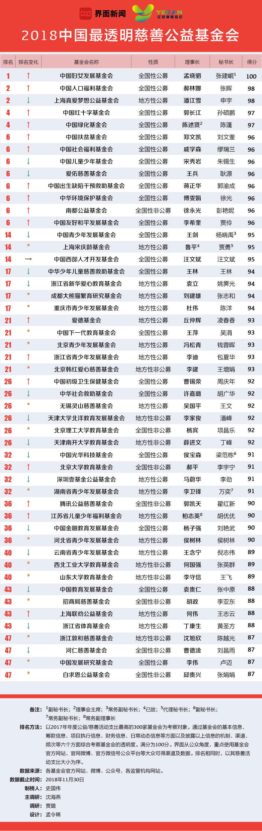 界面联合亿安保险经纪第三次推出2018中国最透明慈善公益基金会排行榜。共有50家基金会入榜,入榜者最高分为100分,入围门槛是87分,平均分为93分。虽平均分与去年持平,但今年出现了满分选手——中国妇女发展基金会强势出线。