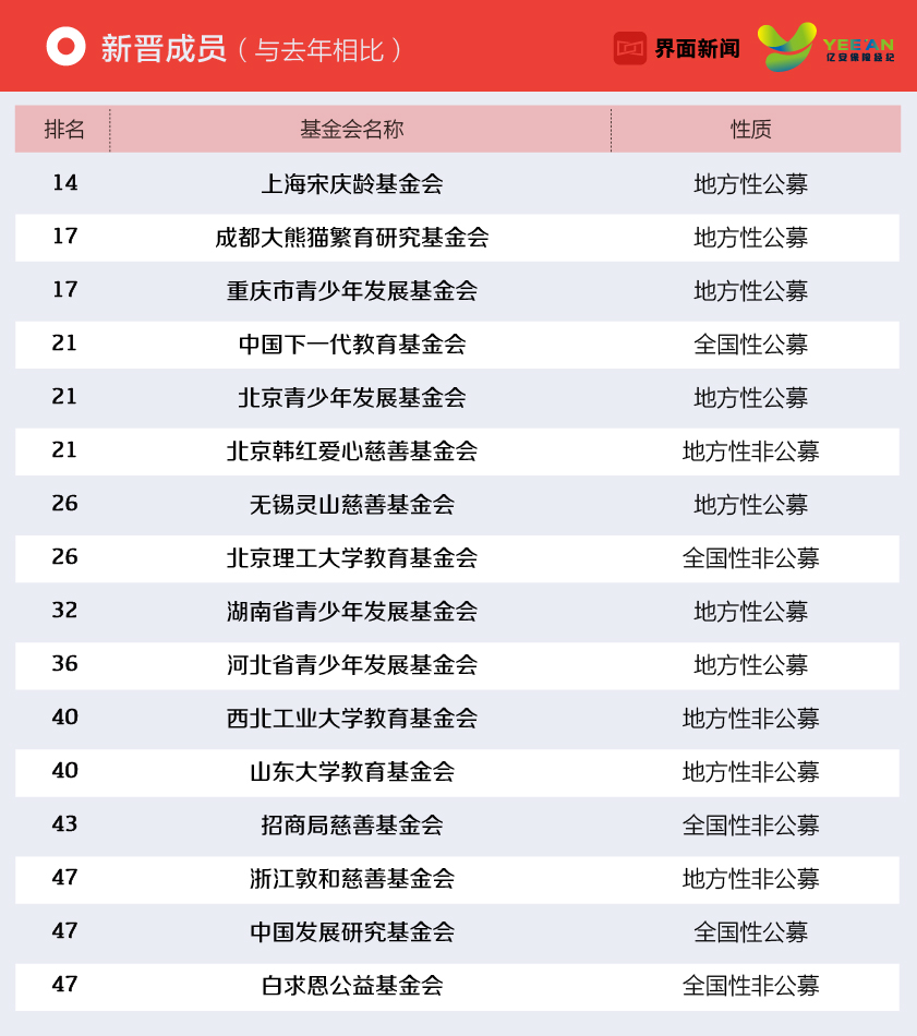 今年最透明慈善公益基金会排行榜加入了16个新成员,越来越多的基金会意识到透明度是提高公信力的主要因素,因此在信息披露和项目执行方面更加规范。其中,上海宋庆龄基金会、成都大熊猫繁育研究基金会、重庆市青少年发展基金会均进入榜单前二十名。