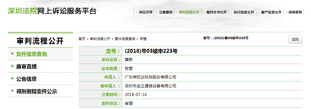 据深圳法院网上诉讼服务平台案件信息(案号:(2018)粤03破申223号、225号)显示,与华兴银行同日对金立通信提出破产申请的,实际上还有两个金立供应商债权人:广东伟旺达科技股份有限公司(下称“伟旺达”)、诠鼎科技股份有限公司(下称“诠鼎科技”)。