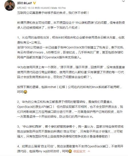 随着事件的不断扩大,华为云总裁郑叶来也在个人微博发文谈及云计算行业的开源和自主可控问题。他表示,不要混淆““中山装和西装”,不要用所谓的“自主可控”来作文章。国家非特定保密领域就应该鼓励开放而不是鼓动所谓的“自主可控”,“如果这么强调自主可控,就应该勇敢宣布不支持OpenStack接口,不使用开源代码。”