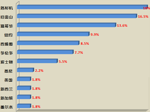 而随着国内房地产市场放慢速度,海外置业日益升温,尤其是北美地区特别热门。《报告》统计,美国洛杉矶、旧金山和温哥华是高净值人群最青睐的海外置业城市,前十大最受欢迎的海外置业地中有7个城市源自北美。胡润表示:“万达、绿地和泛海三个集团都在洛杉矶引起了很大关注。”