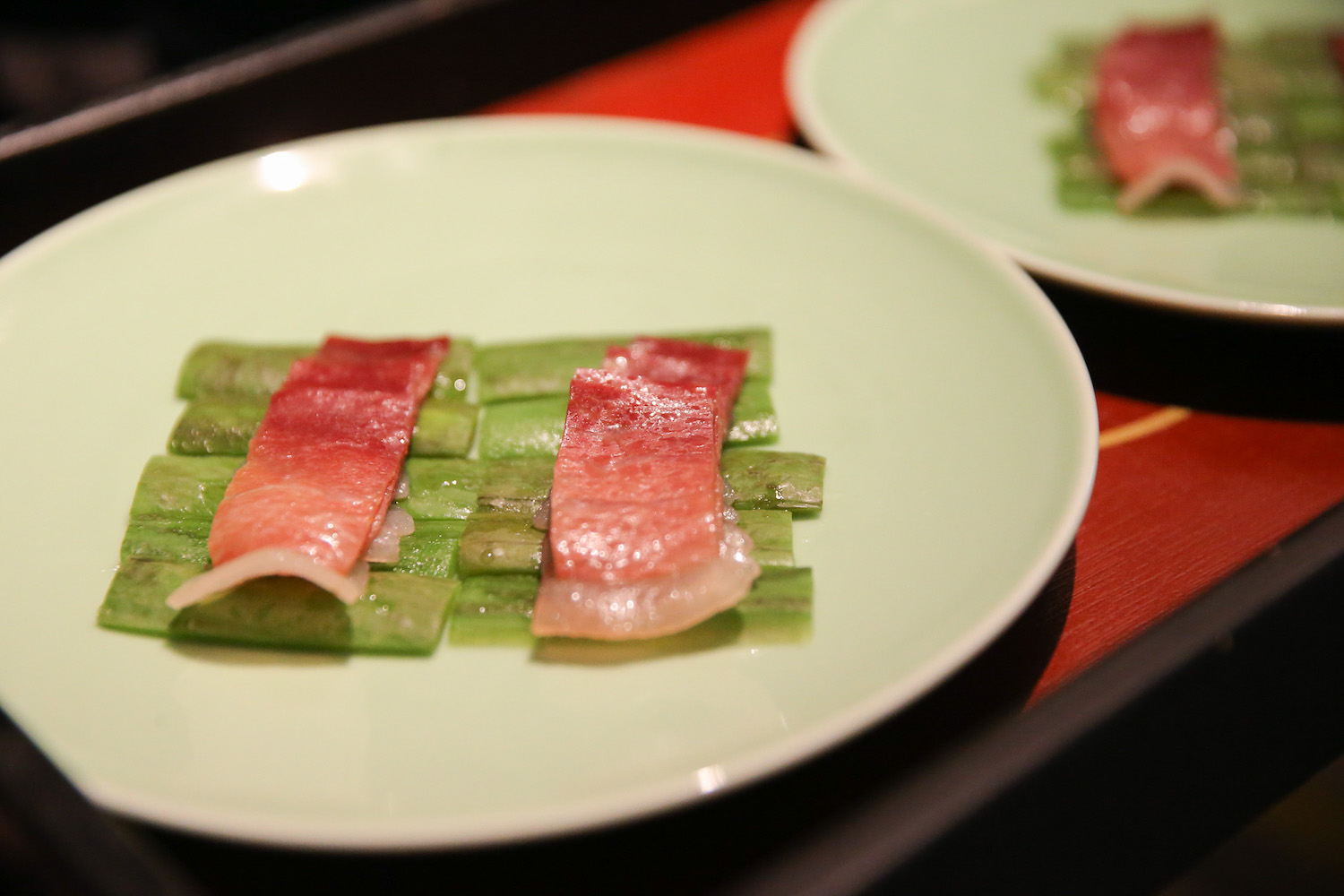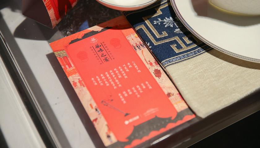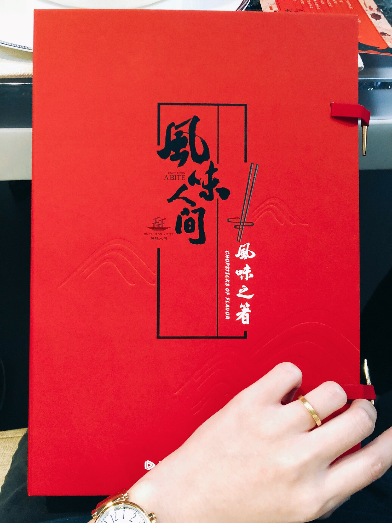 入席落座,每人面前都摆着一个红色盒子装的“风味之箸”,打开这本沉重的大部头,才能把藏在里面的筷子拿出来用。