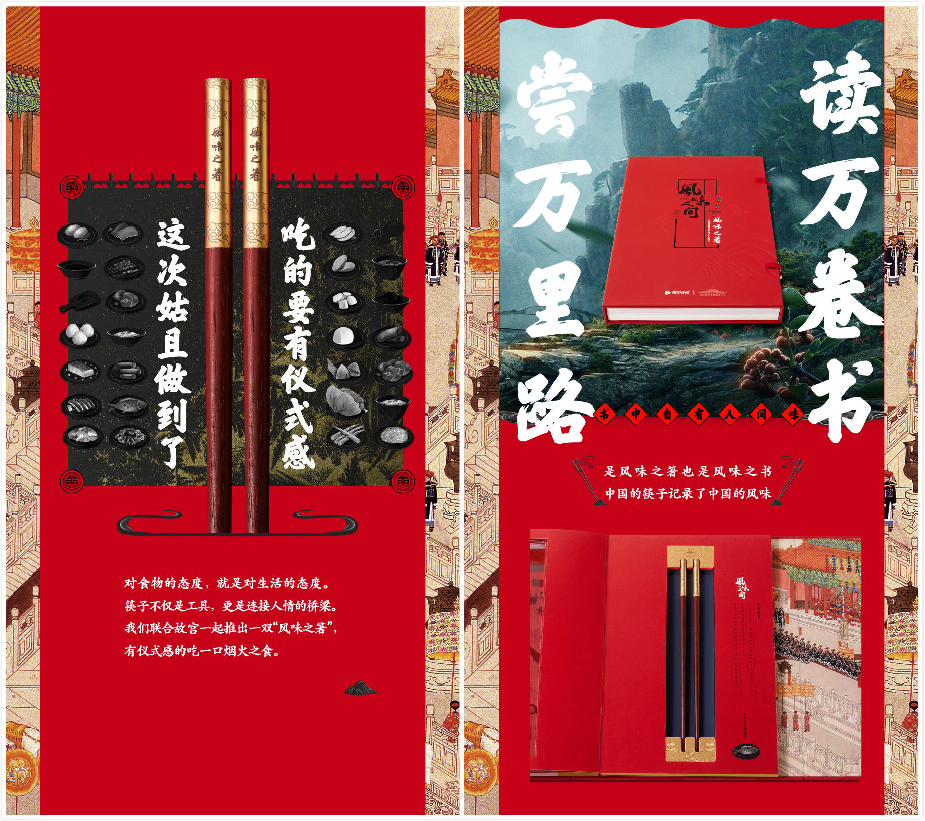 “经过反复考虑和确认可行性之后,风味之箸的主体颜色,采用了‘宫墙红’色的红木来突出故宫和传统的气质,筷子头是铜镶金工艺按照故宫的建筑传统纹样设计,可以让整体更加颜色明快,和宫墙红对比突出了古典美和现代气质。”腾讯视频项目负责人说,“包装整体是一套书籍的设计,每一页都是风味人间中一道菜的故事,也希望这个筷子能将美食背后文化清楚地讲出来。”