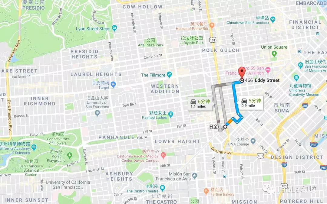 466 Eddy Street, SF, CA 94109旧金山驾车出发约5分钟到达