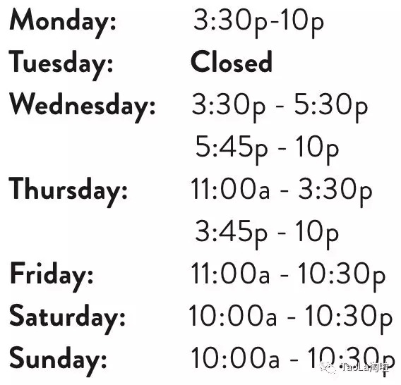 周一、三、四、五12pm-12am;周六日10am-12am;每月第一个周二6pm-12am仅限女性;每月第三个周二6pm-12am仅限男性