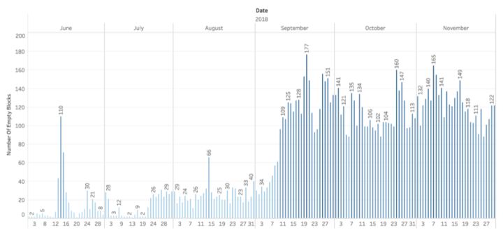 好消息是,以太坊矿工还在,只是赚的少了很多;坏消息是,有的矿工正在利用某些策略获取更多利润。在利益面前,矿工们开始改变策略来获得更多利润,以太坊空区块数量从 9 月份开始暴涨了 5-7 倍,有的矿池以挖空块为主要盈利方式,一年挖出的区块中有 86% 的区块为空块。