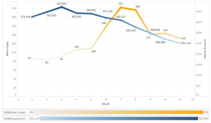 另一种量化矿工工作量缩减的好方法就是,计算向矿池贡献算力的个体矿工所支付的款项数目,即矿池给矿工打款情况。在前面的图表中我们可以看到,这个数字出现了清晰而平稳的下降趋势。