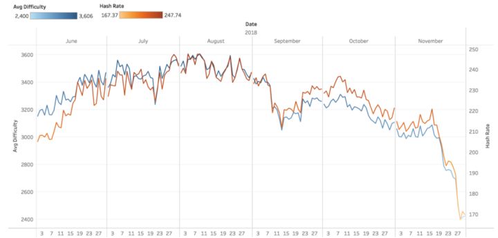 与此同时,难度和算力的下降也能反应出采矿活动的下降——不过这并不一定表明矿工数量的减少,但是它肯定反映出了挖矿设备数量的下降。这里所说的「矿工」是指在区块链上开采区块的地址,而不是指代它背后真实的个体。在大多数情况下,这些地址是矿池,其中有数百个个体注册用户提供他们分散的算力。