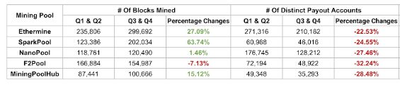 其中有 3 个((F2Pool_2, Ethermine 和 Nanopool))都是目前算力排名前五的矿池,这一点都不足为奇。从下表中我们可以看出在 F2Pool_2 中突出地显示出了空区块产量的大幅度增长。正如我们在上文中从排名前五的矿池中总结出来的,他们同样也是下半年里表现最差的矿工。