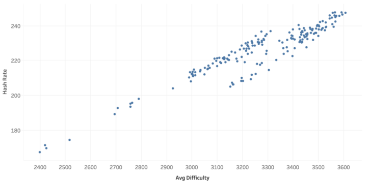 从上图中我们可以看到,随着算力在网络上的波动,任务处理难度也会随着时间的推移而变化,在 9 月和 11 月都出现了两次较大的下跌,下面的散点图也显示了类似的正相关关系。