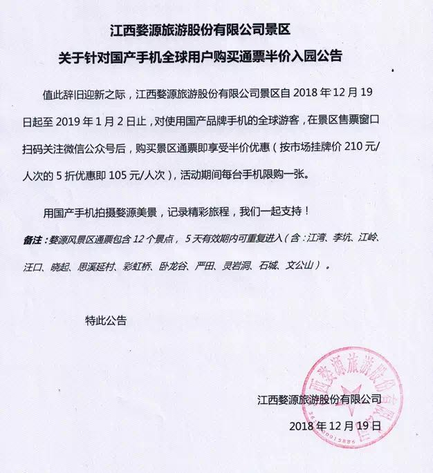 继河南神农山风景区对华为手机用户免门票后,江西婺源旅游股份有限公司景区也发布信息,自2018年12月19日起至2019年1月2日止,对使用国产品牌手机的全球游客,在景区售票窗口扫码关注公众号后,购买景区通票即享受半价优惠,该通票其中包涵一个5A景区,7个4A景区。活动期间每台手机限购一张。