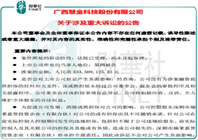 就在公司公告之后,12月12日突然收到江西省高级人民法院送达的《江西省高级人民法院应诉通知书》、《江西省高级人民法院举证通知书》、《中江国际信托民事起诉状》及相关起诉文件,广西慧金科技股份有限公司(简称:ST慧球)作为第四被告发被起诉。