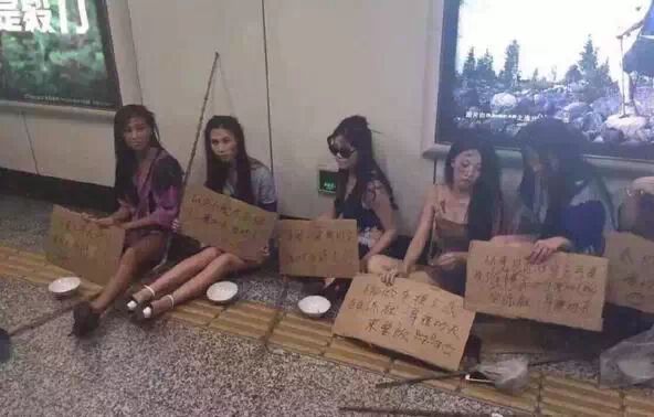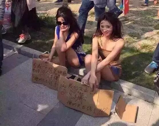 比起男车模的争宠,这帮女孩子可就可怜多了。在车展开幕那几天,就有车模扛着牌子出现在现场抗议。而在4月26日,又有一大波美女车模打扮成乞丐,在上海徐家汇街头乞讨,以抗议车展拒绝车模导致自己失业。这群可怜的姑娘..好想把你们带回家T^T