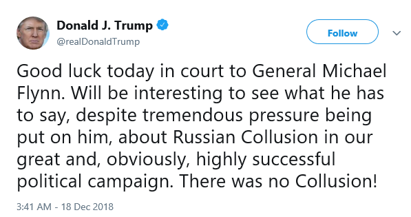 “祝弗林将军今天在法庭上好运。尽管他面临着巨大的压力,但听听他对所谓的与俄罗斯勾结和我们伟大而胜利的竞选怎么说将会很有趣。没有勾结!“